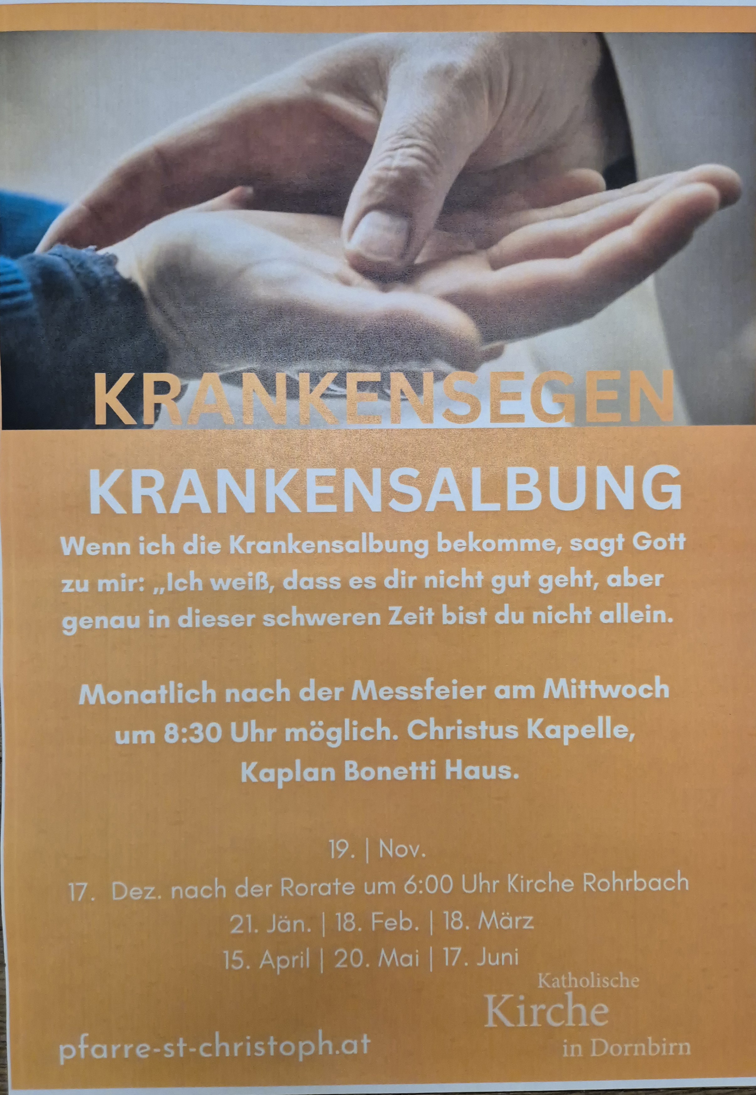 Die Krankensalbung kann monatlich nach der Messfeier am Mittwoch um 8:30 Uhr in der Christuskapelle des Kaplan-Bonetti-Hauses empfangen werden.