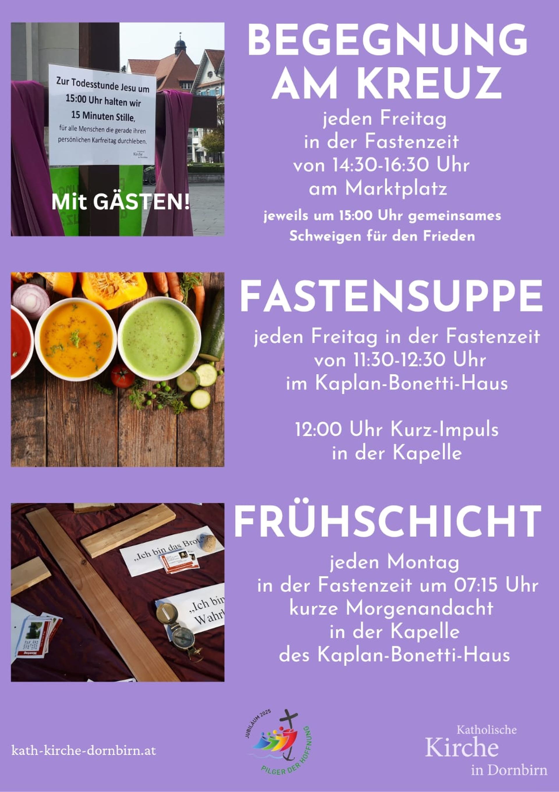 Jeden Freitag in der Fastenzeit von 11:30 bis 12:30 Uhr im Speisesaal des Kaplan-Bonetti-Hauses. Um 12:00 Uhr gibt es einen Kurzimpuls in der Christuskapelle.